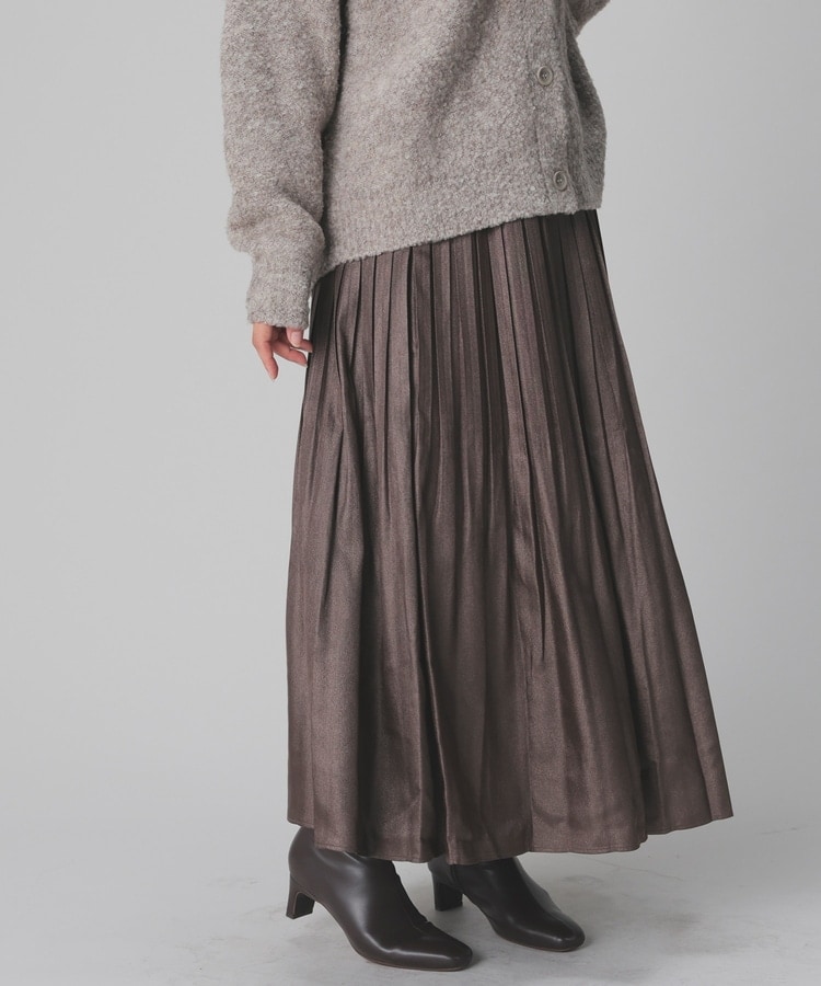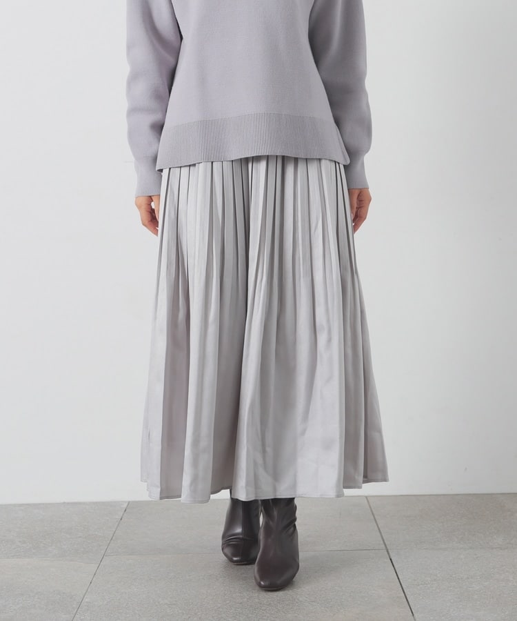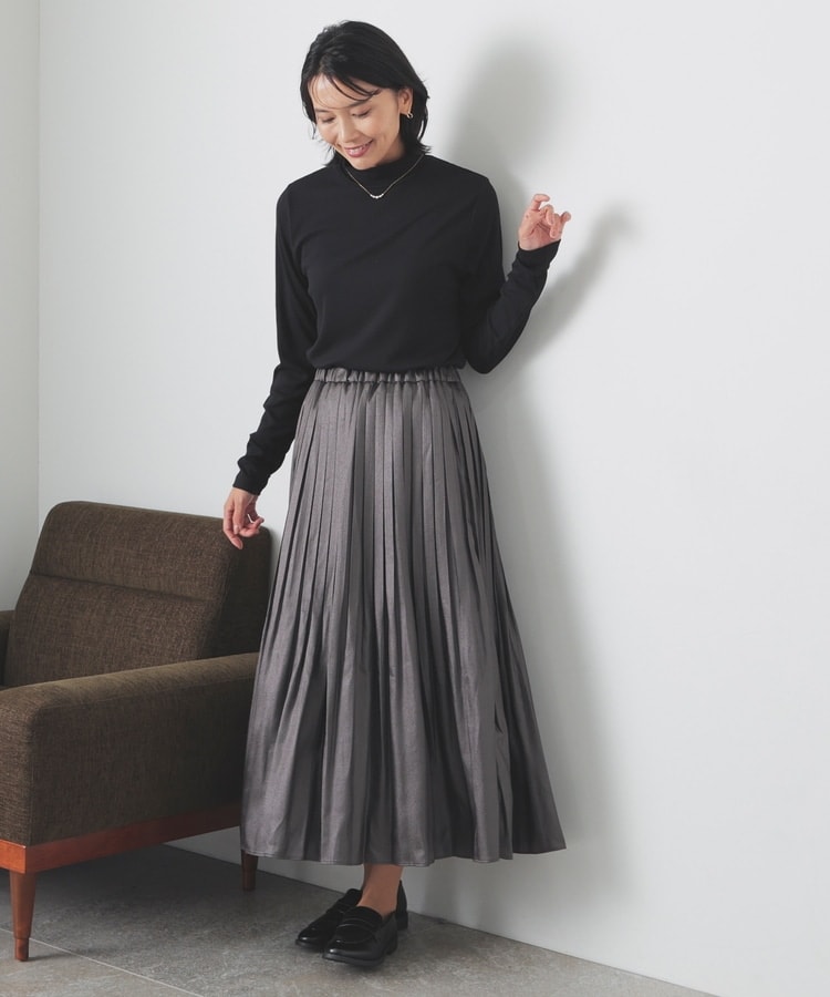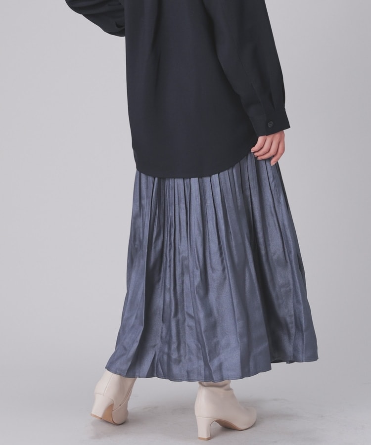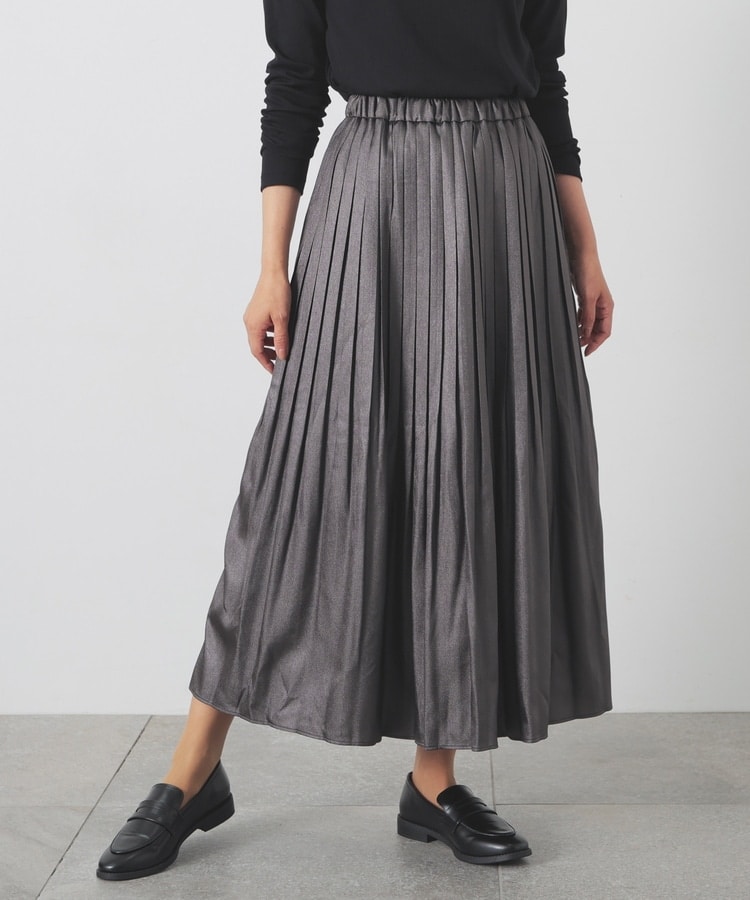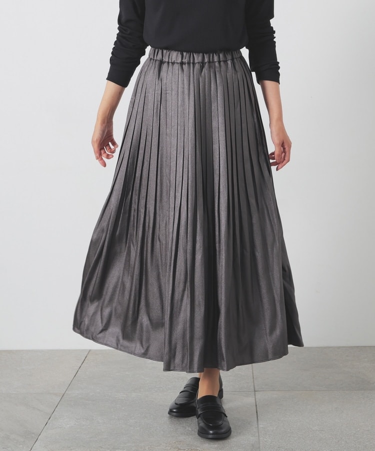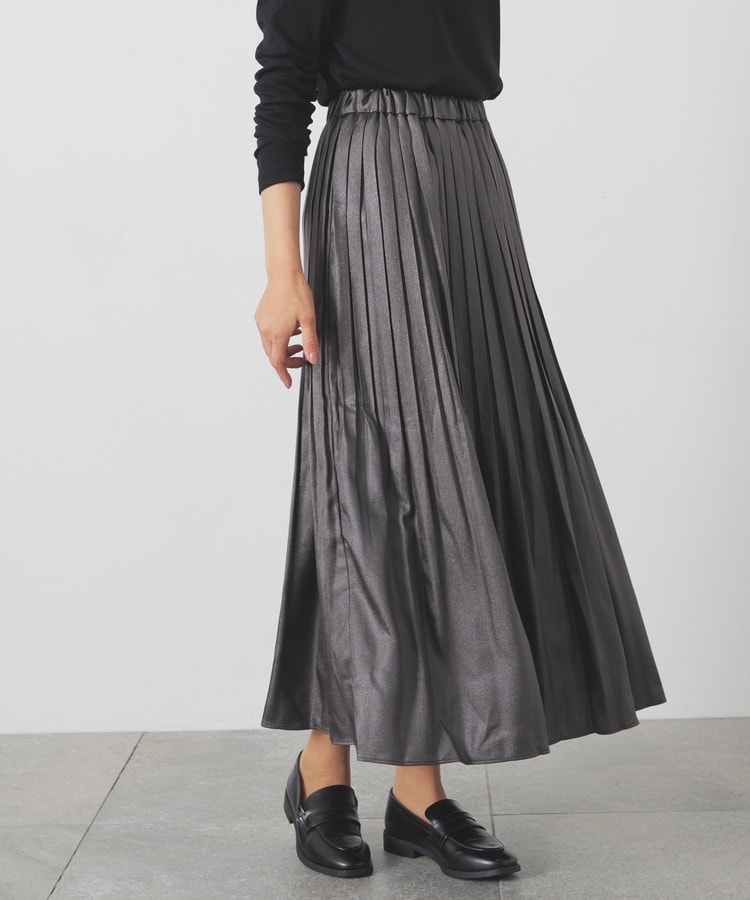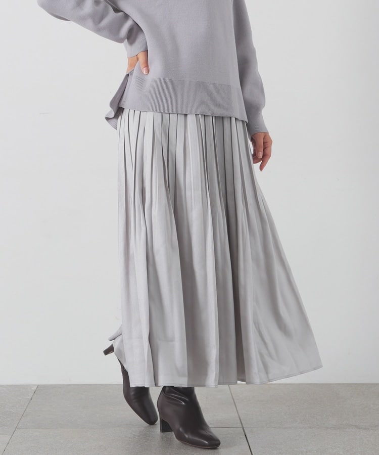 裾に向かって消えるようなプリーツ加工で、上品ながら重くなりすぎない印象に。