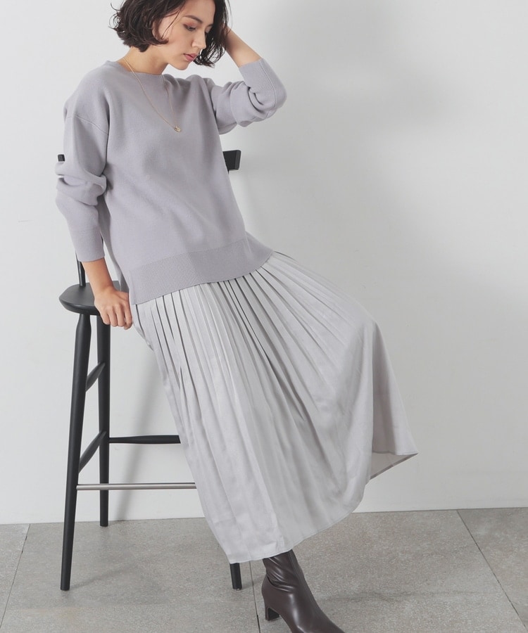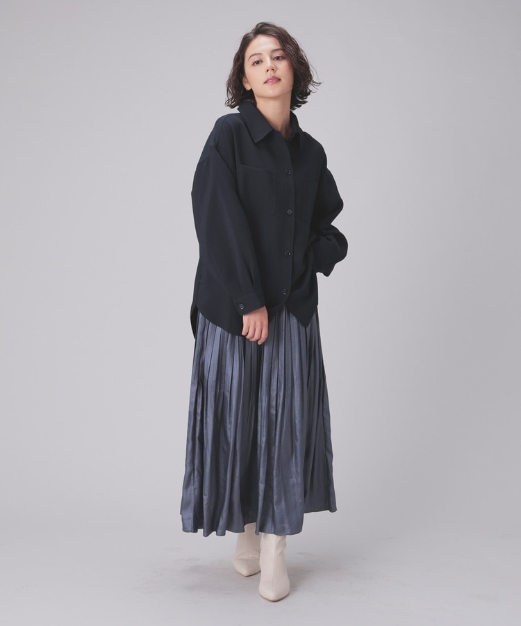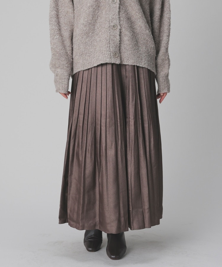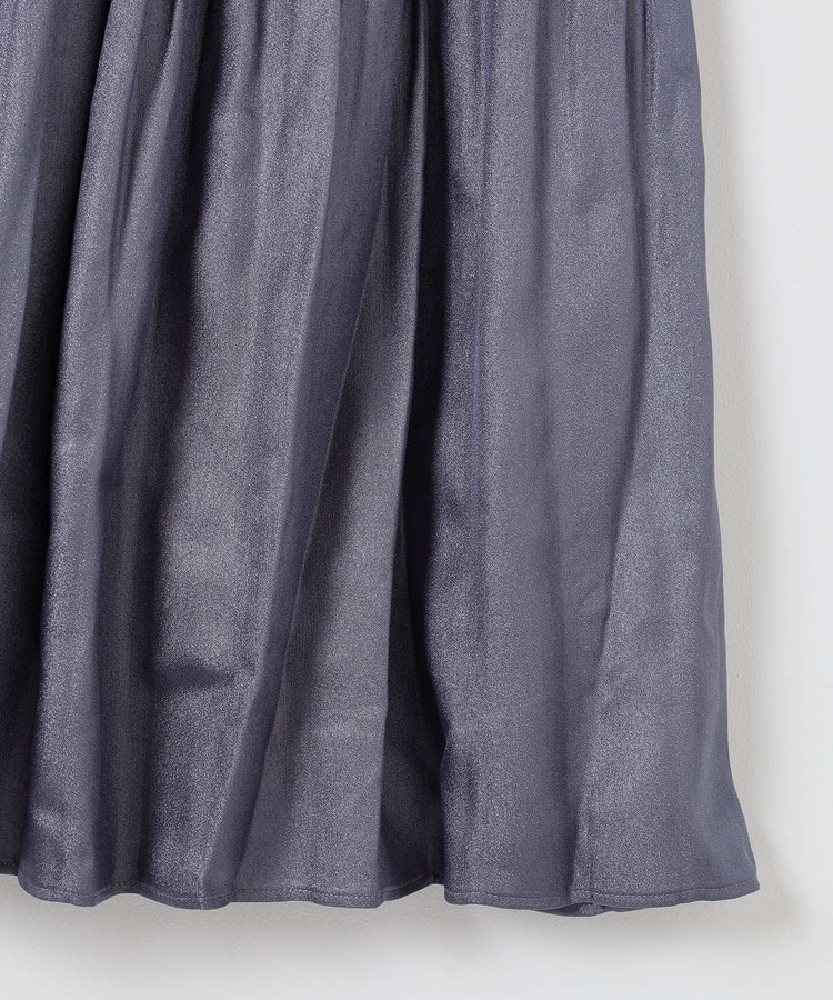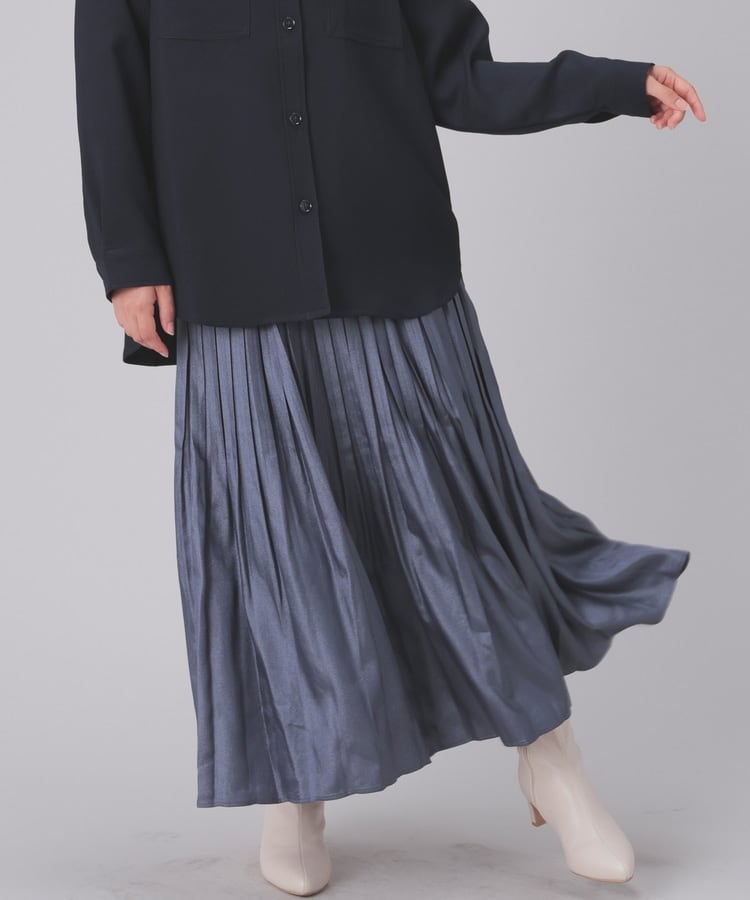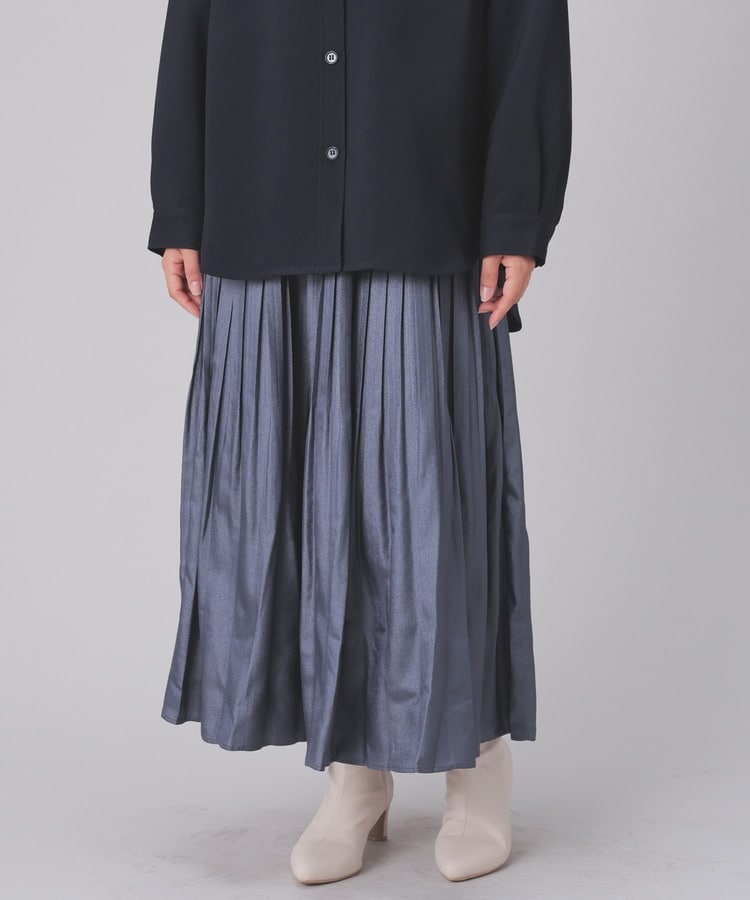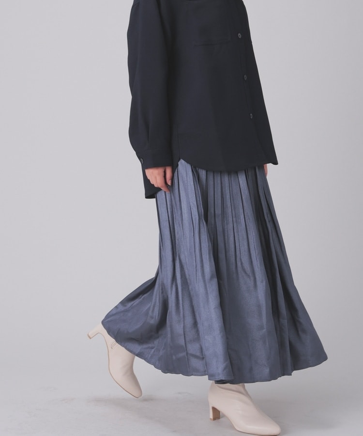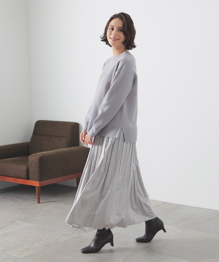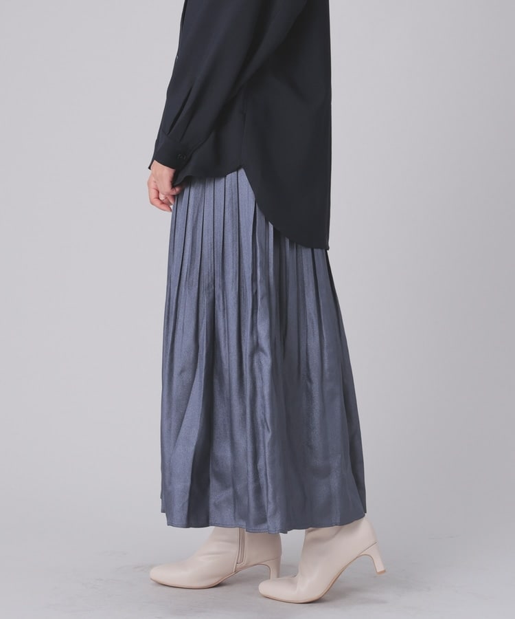裾に向かって消えるようなプリーツ加工で、上品ながら重くなりすぎない印象に。
