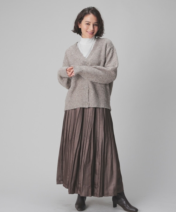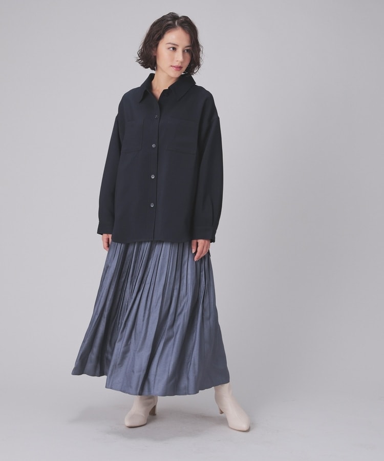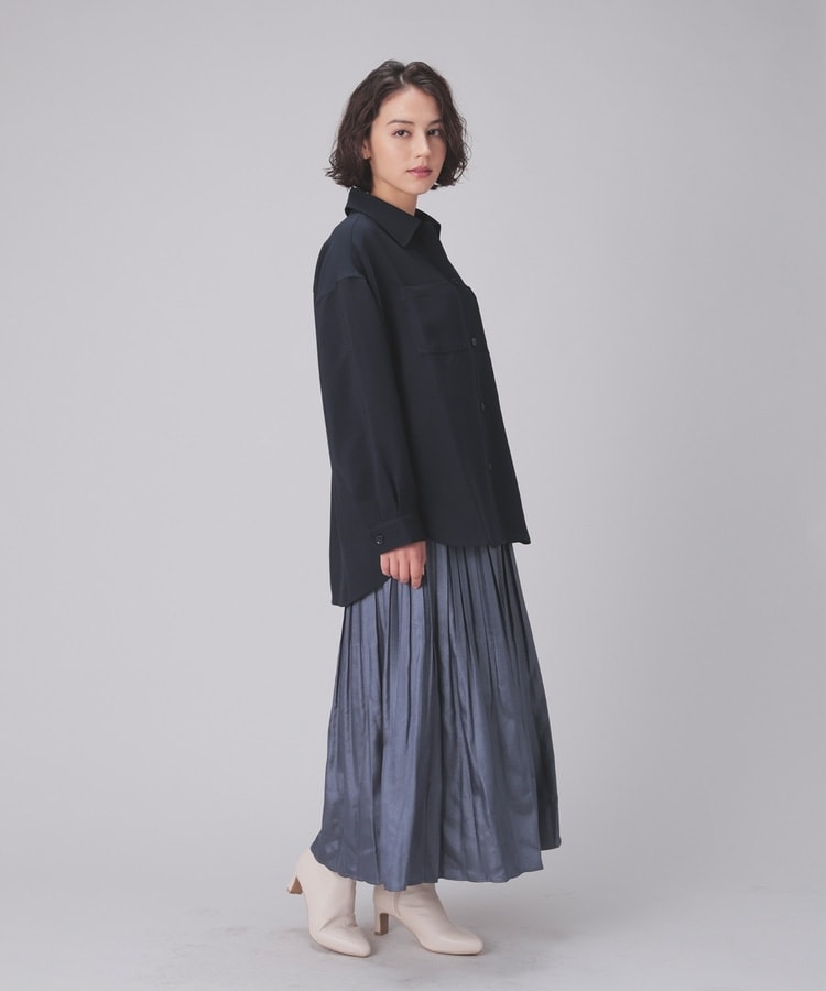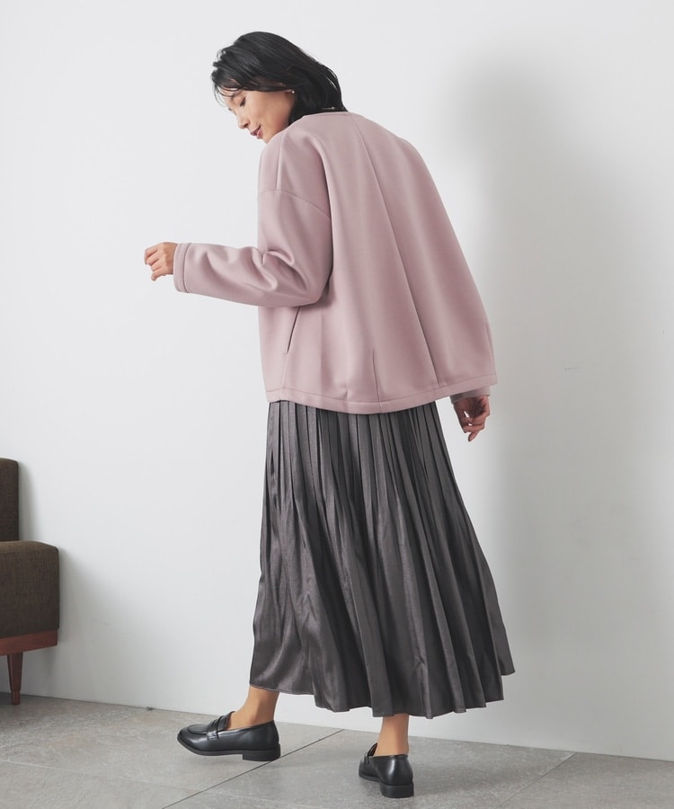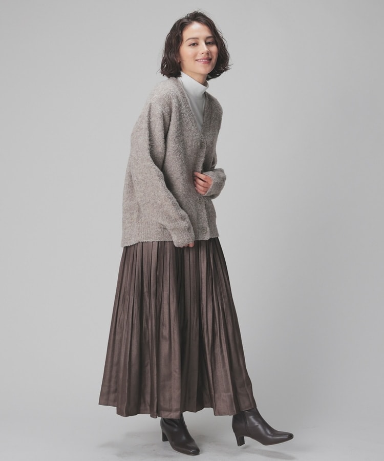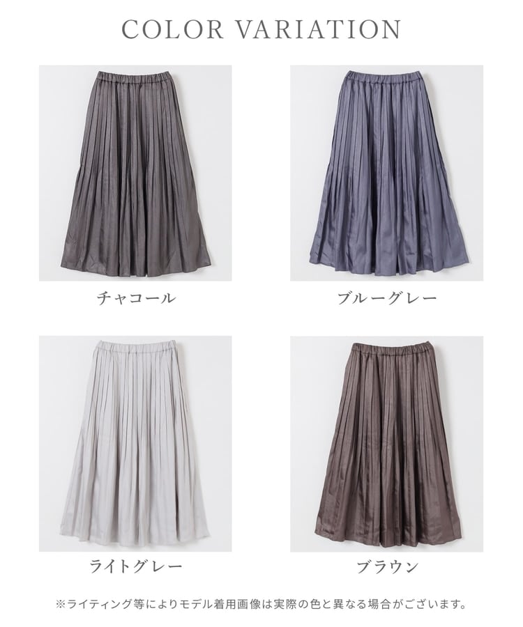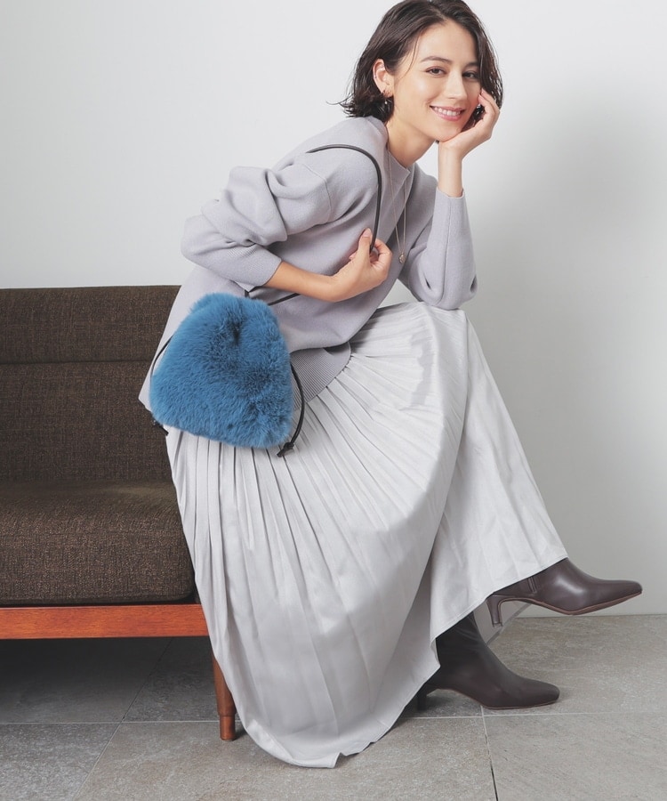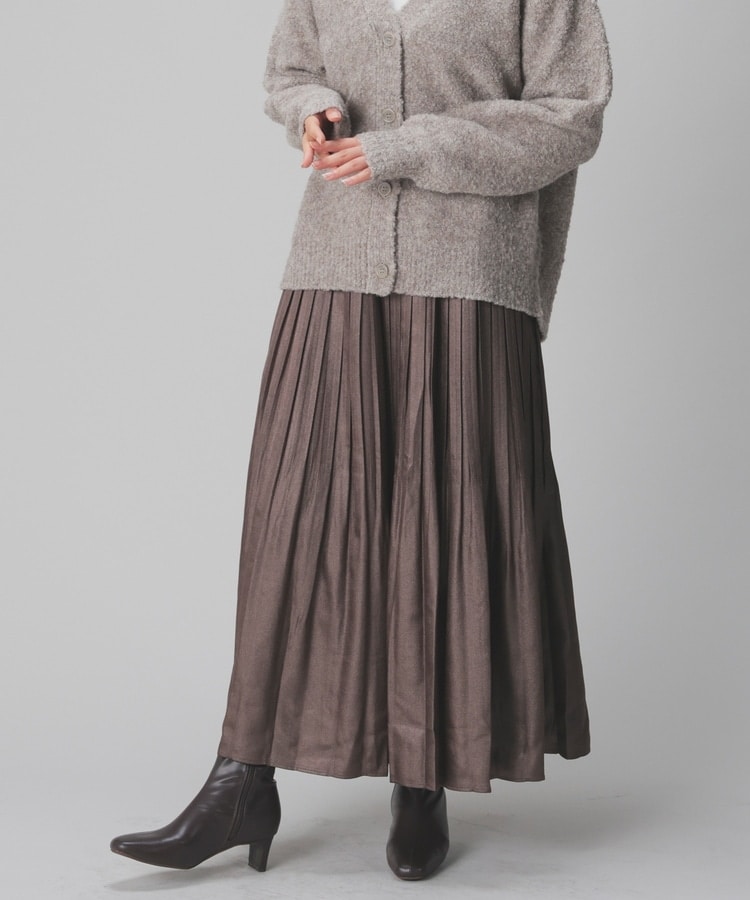 裾に向かって消えるようなプリーツ加工で、上品ながら重くなりすぎない印象に。