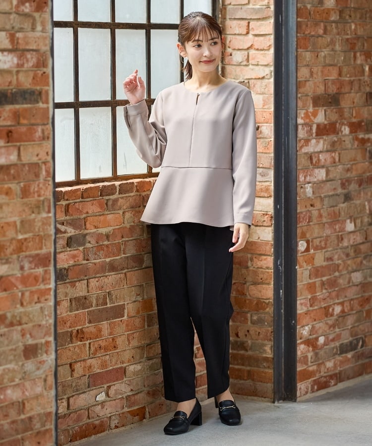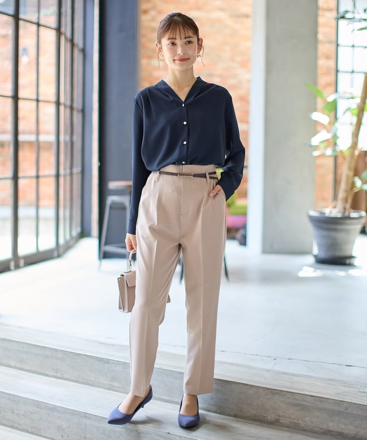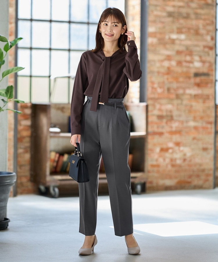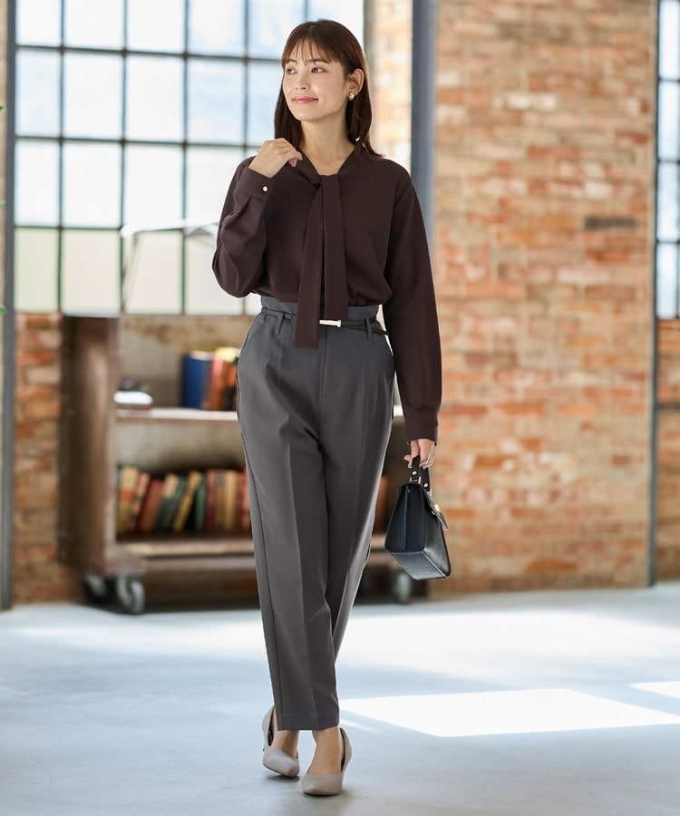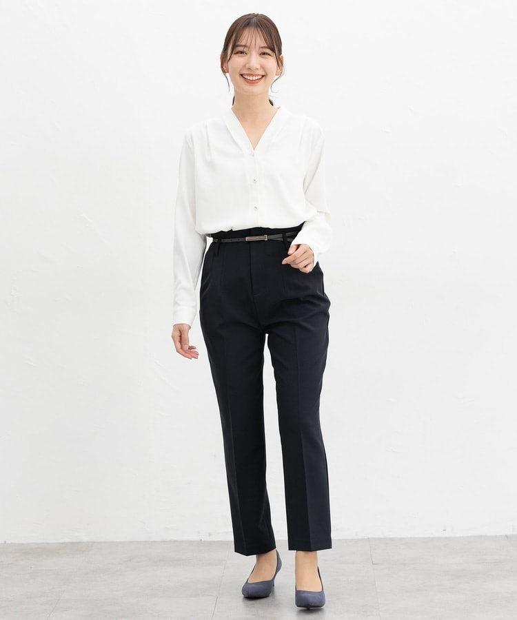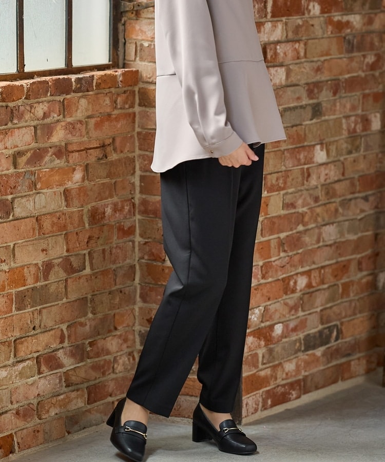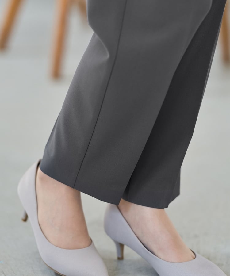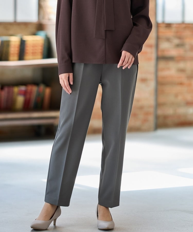 裾に向かって細くなるシルエットにセンタープレス入りで、きちんと感も美脚も叶えるデザイン。